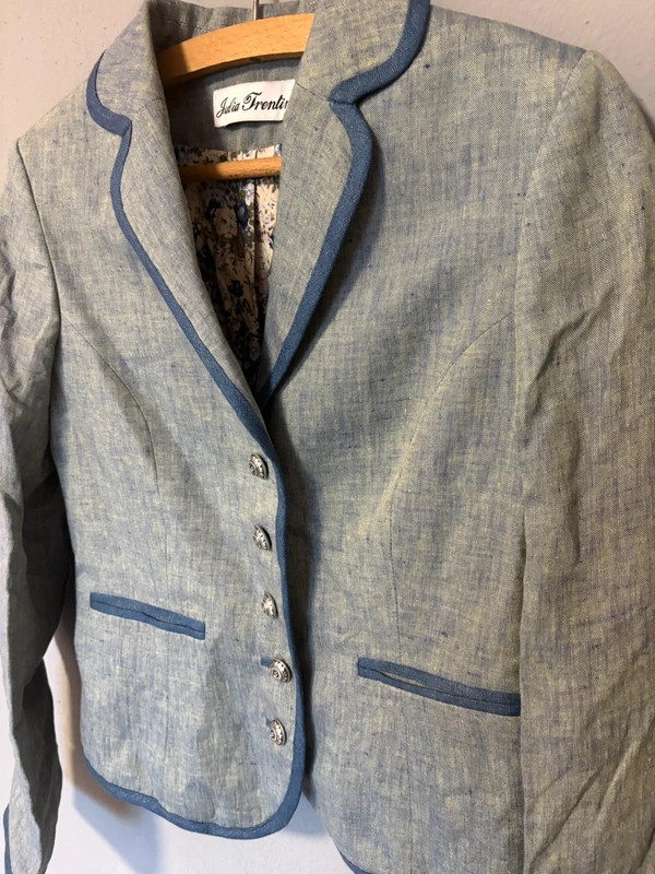 Elegantní dámské sako značky Julia Trentini v tradičním trachten stylu, vyrobené z kvalitního lněného materiálu. Spojuje klasickou eleganci s lehkostí a pohodlím, díky čemuž je ideální pro slavnostní příležitosti i stylové každodenní nošení.